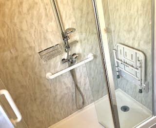 Grab rails were added to the shower to aid with getting in and out. A shower basket was also added for convenience and a shower seat provided a spot to relax whilst in the shower area.